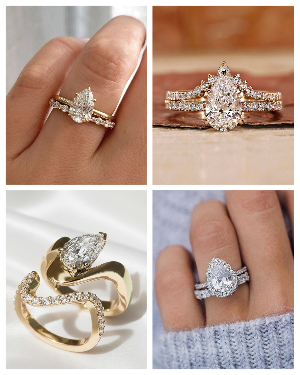 Najlepiej sprawdzają się obrączki wyprofilowane lub w kształcie litery V (szewronu/zygzaka), które podążają za linią kamienia i jednocześnie go zabezpieczają. Bardzo ciekawym rozwiązaniem są także obrączki z dodatkowymi diamentami w kształcie gruszki, ustawionymi tak, aby powielały motyw centralnego kamienia. Taki zestaw tworzy spójną, wyrafinowaną kompozycję o dużej lekkości wizualnej.