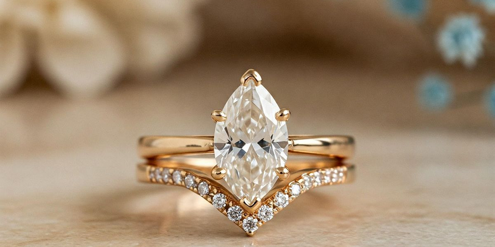 Szlif markiza to odważna i wyrazista forma o wydłużonym kształcie i ostrych końcach. Kamień często „wychodzi” poza linię palca, co sprawia, że standardowe obrączki nie są w stanie dobrze się dopasować. W tym przypadku niemal niezbędne są obrączki w kształcie litery V lub szewronu (zygzaka), które odzwierciedlają ostre zakończenia diamentu.