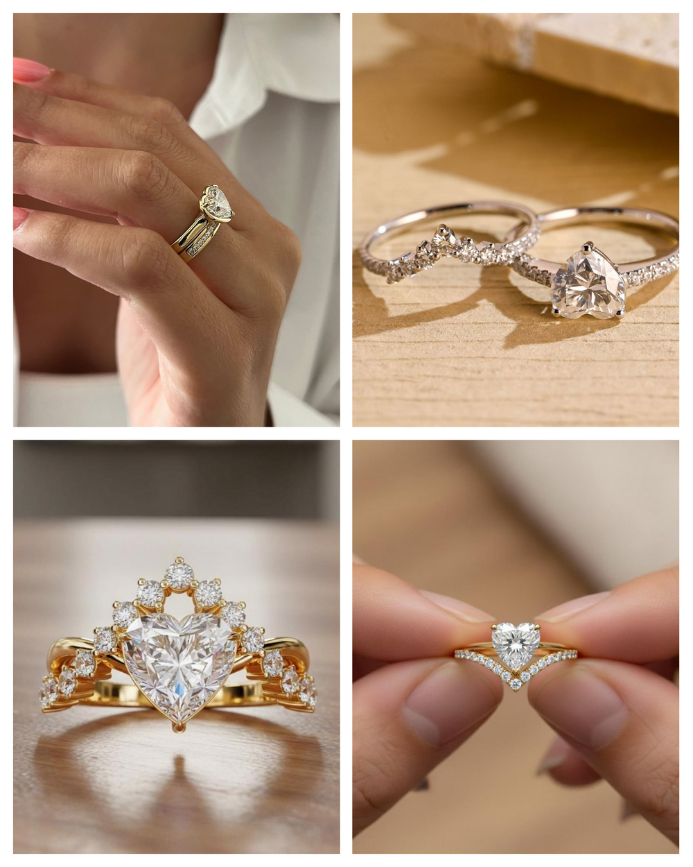 Cienkie, proste obrączki pozwalają skupić całą uwagę na diamentowym sercu, natomiast modele pavé dodają subtelnego blasku, nie przytłaczając jego formy. To zestawienie, w którym kluczowa jest równowaga między symboliką, a estetyką.